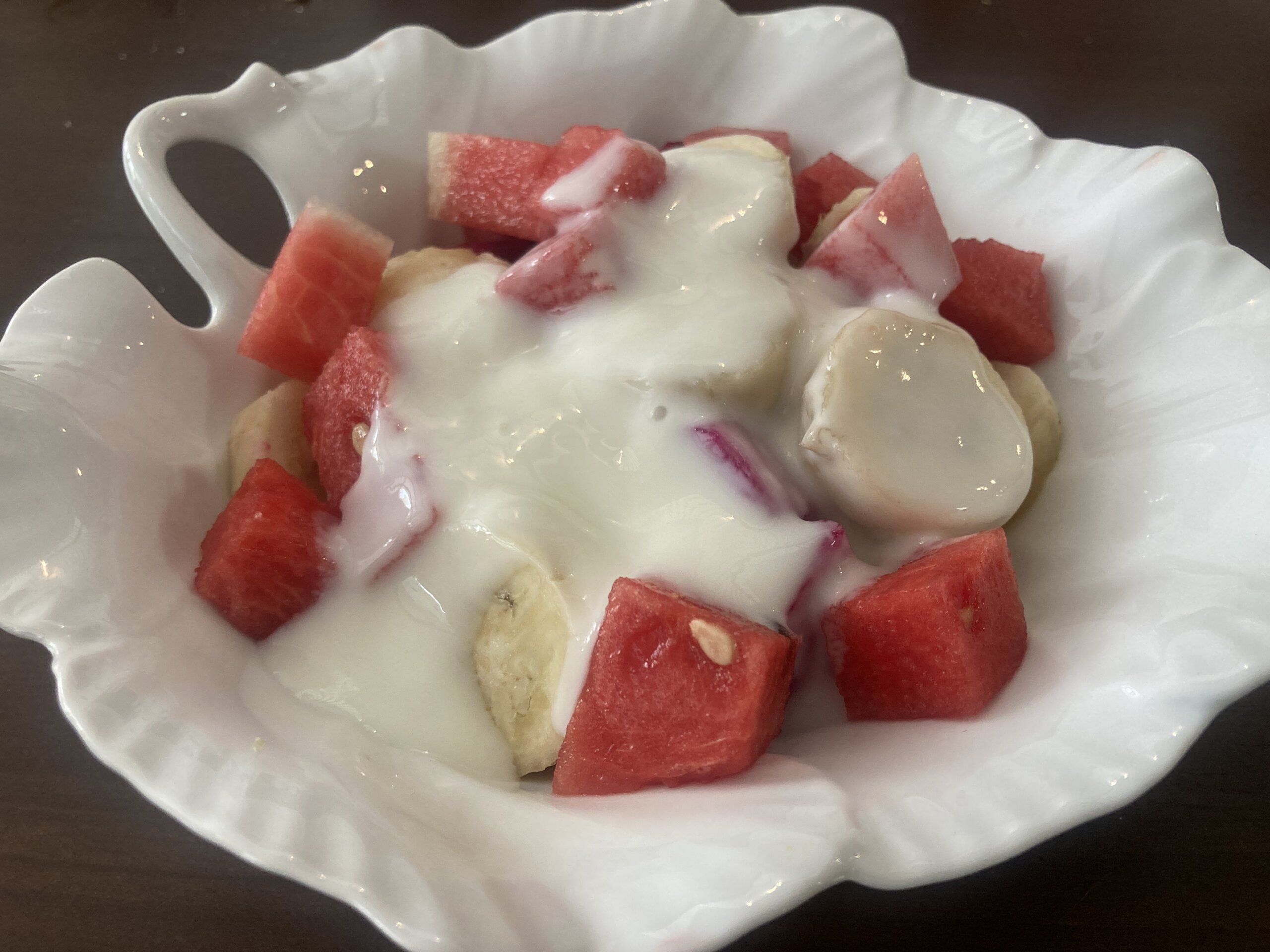 朝食でフルーツヨーグルト(意外と皿が大きい💦)