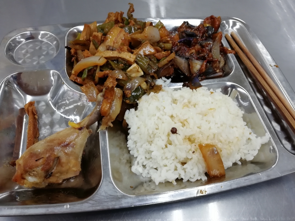 とてもお腹が空いてたので、好物の茄子の入った右上の料理から食べ始めました。味は悪くないです。ピリ辛で甘めの味が口に合います。ただ、気になるのはお肉です。あれっ、これ豚肉でも、鶏肉でもない。。。うあああ(箸で持ち、手足がこんにちは)